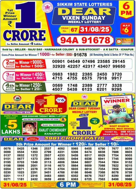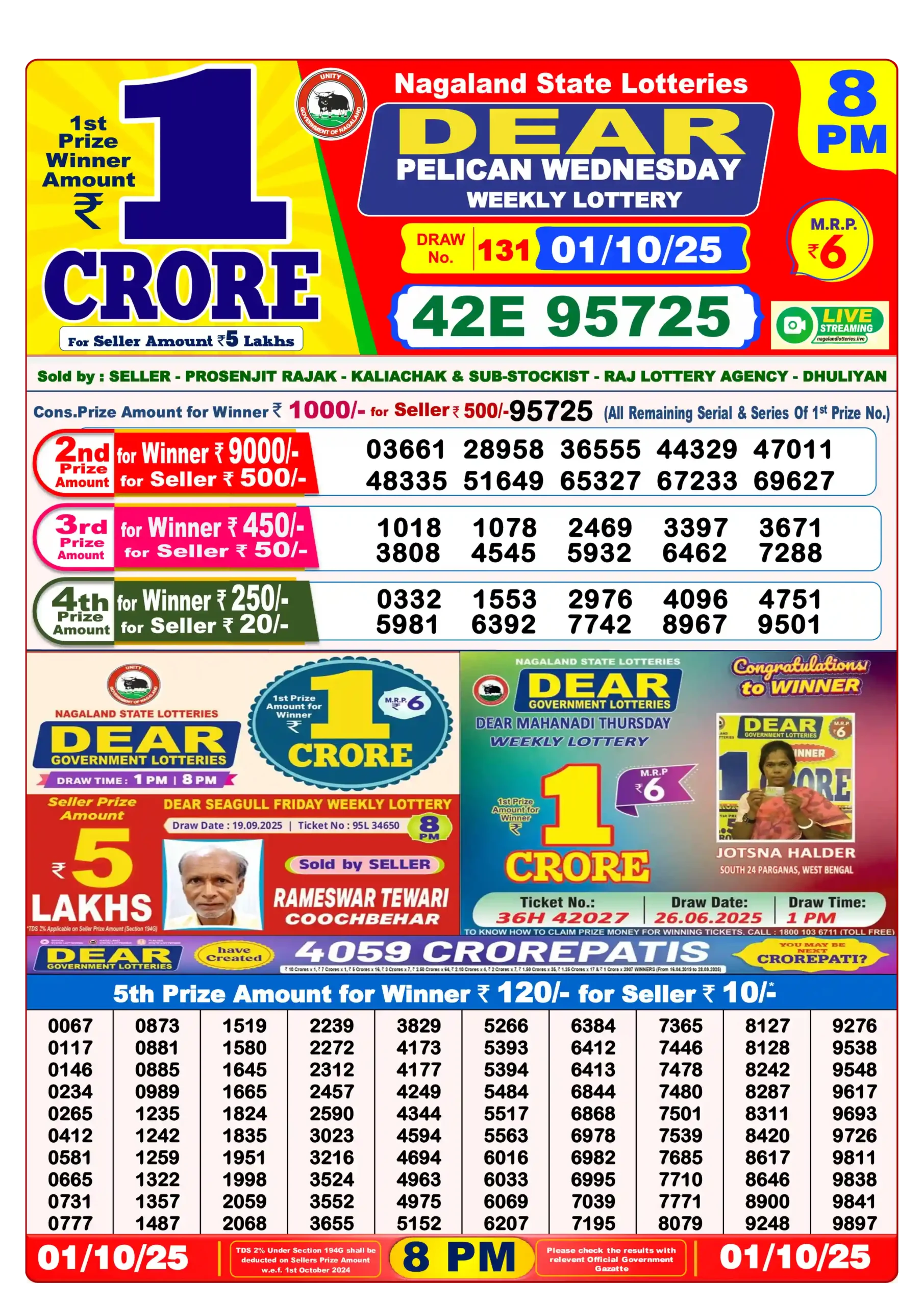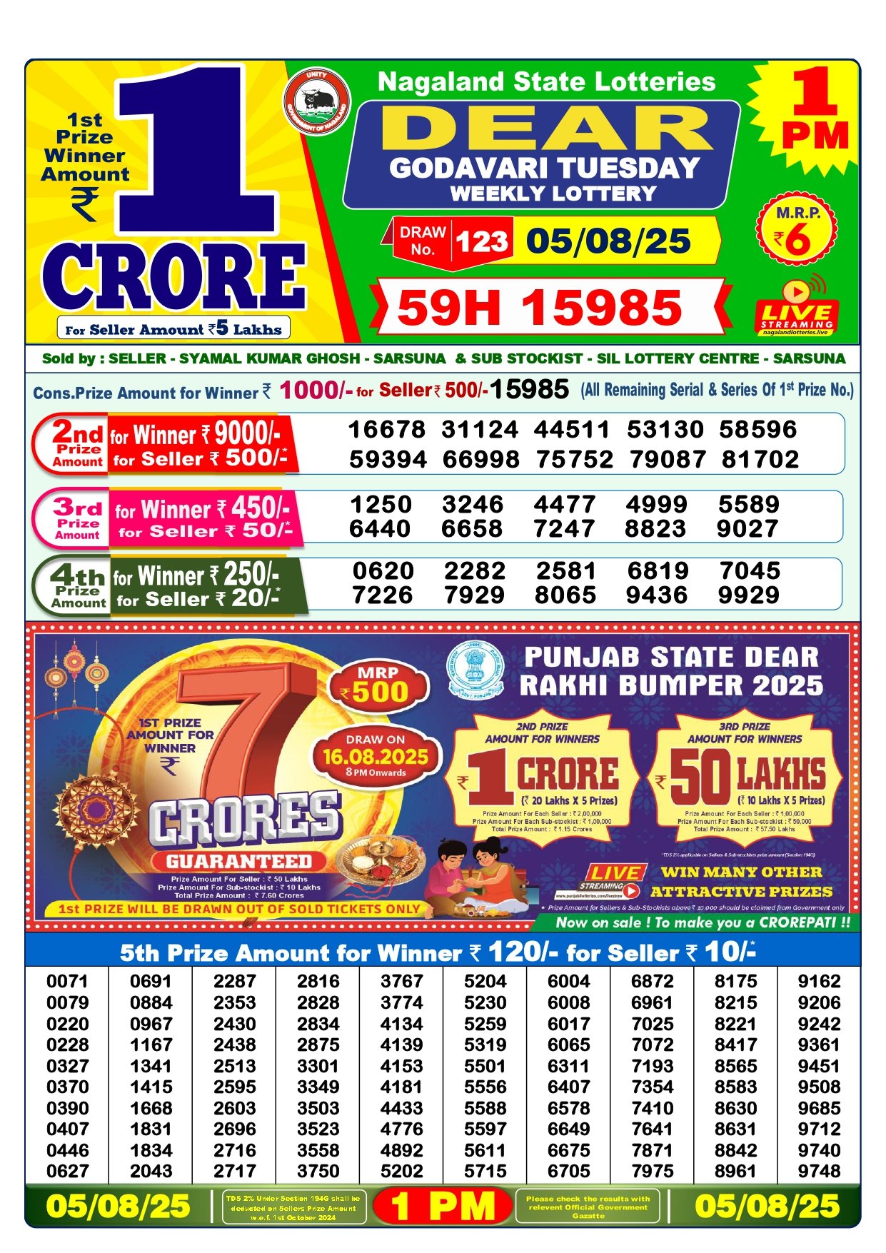 Prize Structure: The Dhankesari Nagaland lottery 1st prize of 1 Crore Rupees can be a life-changing amount. 2nd Prize is 9000 Rupees, 3rd Prize is 500 Rupees, 4th Prize is 250 Rupees, and the 5th Prize Amount is 120 Rupees.